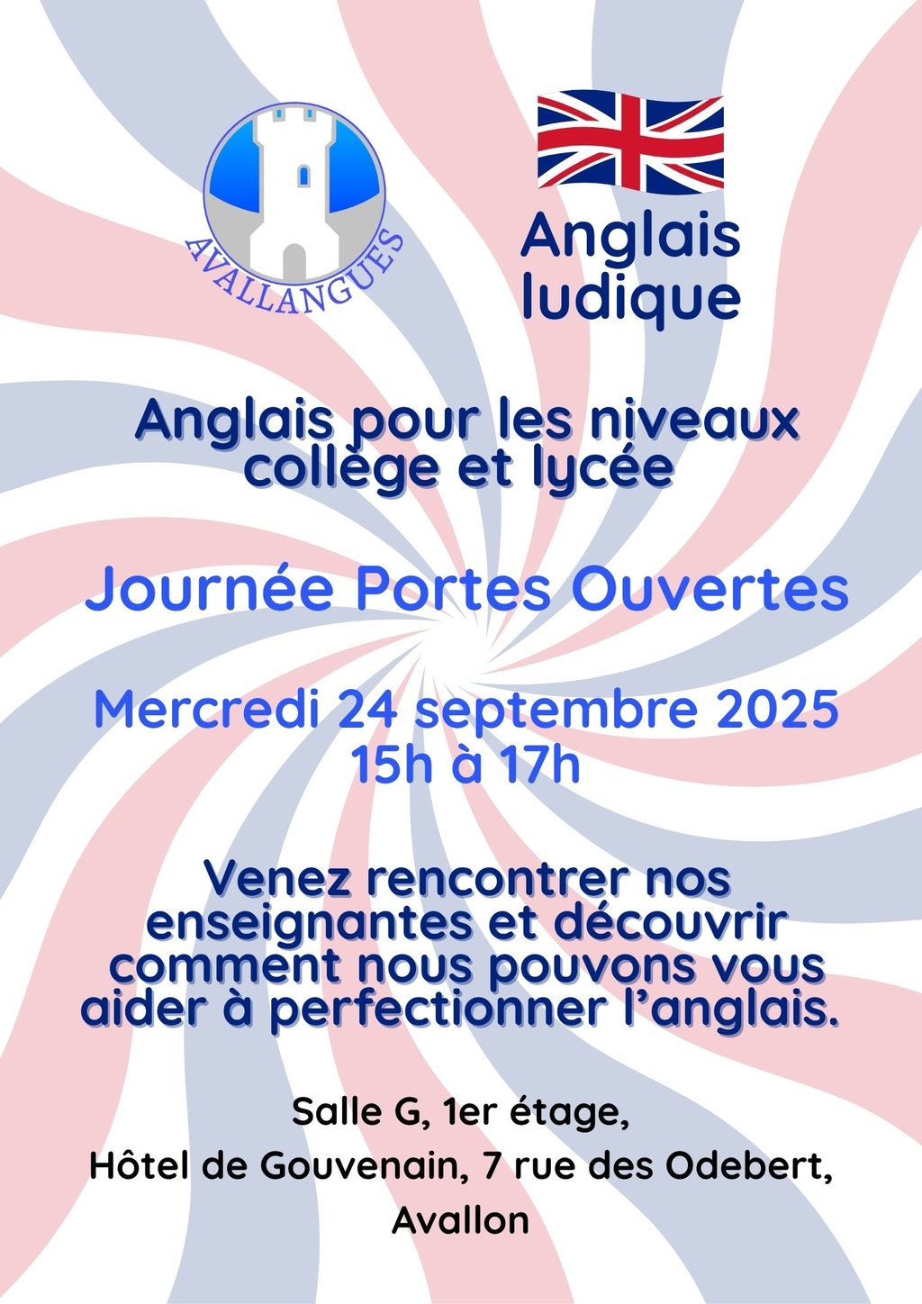 Journée portes ouvertes organisée par l’association Avallangues. Venez rencontrer nos enseignantes et découvrir comment nous pouvons aider à perfectionner l’anglais.